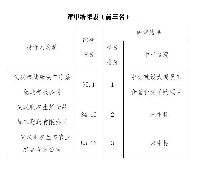 ? ? 經(jīng)評審,綜合評分排名第一為武漢市健康快車凈菜配送有限公司,綜合評分為95.1分,中標(biāo)武漢市政工程設(shè)計研究院有限責(zé)任公司建設(shè)大廈員工食堂食材采購項目。