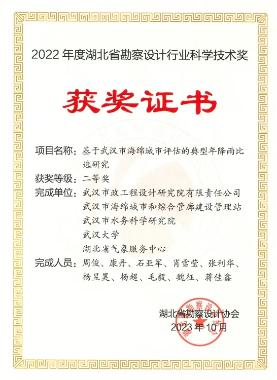 依托“城市內(nèi)澇防治與水環(huán)境流域治理技術(shù)中試平臺”開展的《基于武漢市海綿城市評估的典型年降雨比選研究》獲湖北省勘察設(shè)計協(xié)會科學(xué)技術(shù)二等獎