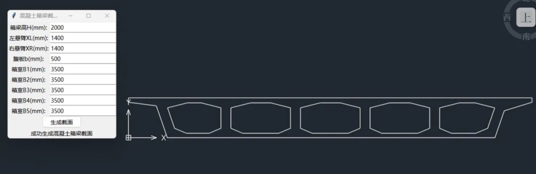? ? 武漢市政院實(shí)踐了多模態(tài)技術(shù)融合路徑——依托DeepSeek大模型深度工程語義理解與智能代碼生成框架,將混凝土箱梁截面的幾何參數(shù)標(biāo)準(zhǔn)、CAD二次開發(fā)規(guī)范等專業(yè)知識(shí)注入大模型認(rèn)知體系,使其生成代碼框架。經(jīng)過多輪調(diào)試,開發(fā)出參數(shù)化生成混凝土箱梁截面的小插件,能夠?qū)崿F(xiàn)箱梁高度、懸臂長度、腹板寬度、箱室寬度等參數(shù)的設(shè)定,并配備可視化界面。