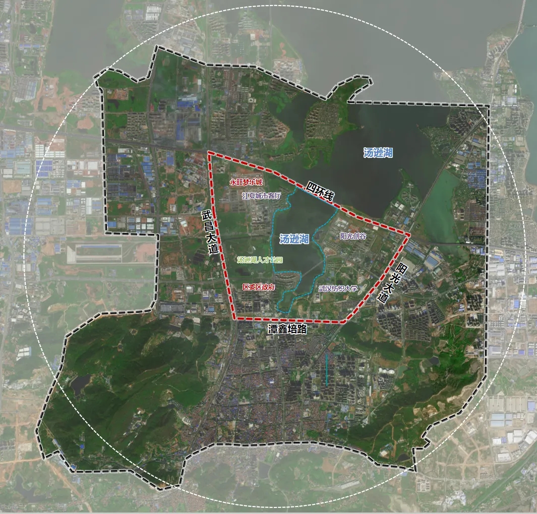 項(xiàng)目核心區(qū)范圍北起四環(huán)線,南抵譚鑫培路,西至武昌大道,東達(dá)陽(yáng)光大道,規(guī)劃區(qū)域面積10.65㎞²(含水域2.2㎞²),研究范圍更延伸至區(qū)界、廟山大道、紙坊大街、黃家湖大道及區(qū)界圍合形成的廣闊區(qū)域。