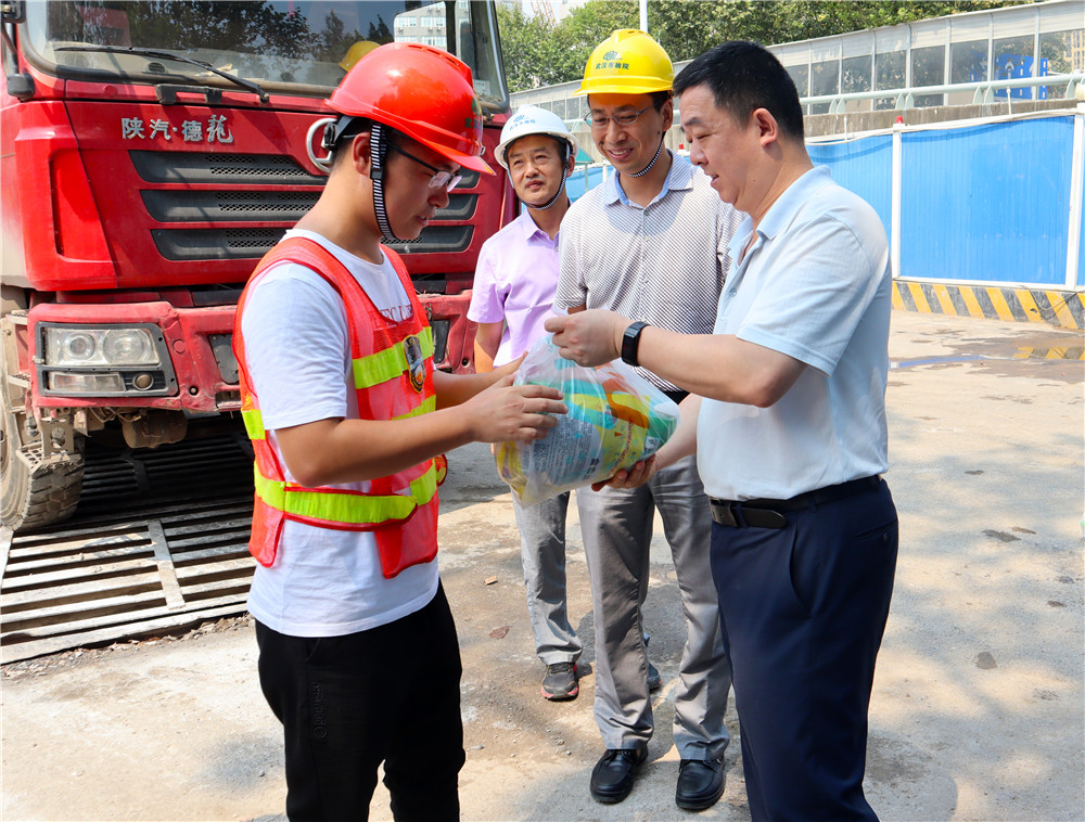 武漢市軌道交通5號線貫穿武昌區(qū)和青山區(qū),是一條溝通順江方向的重要客運交通走廊,公司承擔(dān)了二站二區(qū)間和出入場線設(shè)計和13座車站的第三方監(jiān)測任務(wù)。蔡輝一行親切慰問了執(zhí)行監(jiān)測任務(wù)的勘測設(shè)計院員工,為員工們送上了防暑物資,提醒他們合理安排工作時間,注意現(xiàn)場安全。