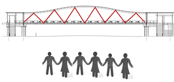 天橋采用充滿韻律感的變截面鋼桁架結(jié)構(gòu),形成多個人字形桁架梁,象征著全國人民手挽手肩并肩,精誠團(tuán)結(jié)共同戰(zhàn)勝新冠病毒。