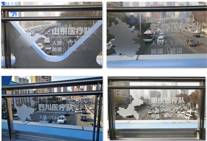 在天橋欄板上鐫刻著馳援湖北的人民解放軍醫(yī)療隊和30個省市自治區(qū)醫(yī)療隊的名稱、人數(shù)、所屬地區(qū)地圖板塊以及支援疫情地區(qū)。時值湖北武漢抗疫的關(guān)鍵時刻,全國各地的白衣戰(zhàn)士逆行而上,馳援湖北,為控制疫情、保護(hù)人民的生命安全做出了巨大的貢獻(xiàn),他們的救城之恩銘刻在每一個湖北人、武漢人的心中。