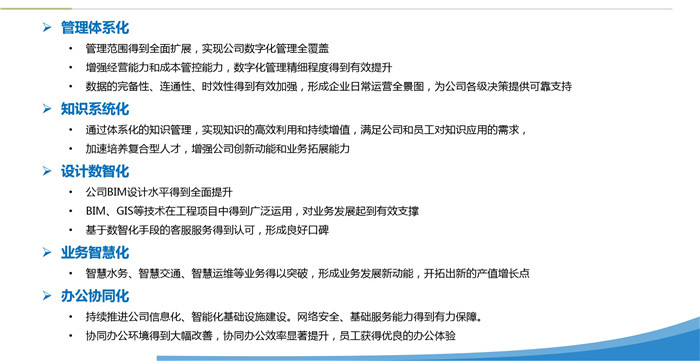 信息中心對《公司2021-2023年數(shù)字化建設(shè)發(fā)展綱要》進(jìn)行了宣貫。近年來,公司緊跟行業(yè)發(fā)展形勢,立足公司實際需要,開展了以日常運(yùn)營、項目管理、智慧平臺、移動辦公等為主要內(nèi)容的數(shù)字化建設(shè)工作,取得了積極成效?!毒V要》立足當(dāng)前公司數(shù)字化發(fā)展需求,提出了管理體系化、知識系統(tǒng)化、設(shè)計數(shù)智化、業(yè)務(wù)智慧化、辦公協(xié)同化五個方面的發(fā)展目標(biāo),明確了各方面的建設(shè)內(nèi)容及相關(guān)組織保障。