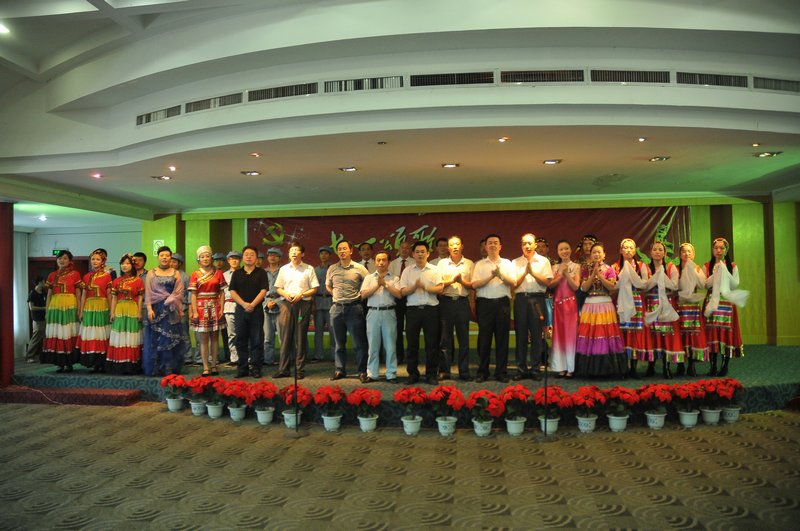 在莊嚴(yán)的《國際歌》中,總結(jié)表彰大會結(jié)束,一臺由公司黨員和入黨積極分子自編、自演的文藝演出正式開始,《再唱山歌給黨聽》、《長征》、《情深誼長》等精彩的歌舞節(jié)目贏得了觀眾的陣陣掌聲,演出現(xiàn)場洋溢著歡樂、喜慶的氣氛。演出最后,各位領(lǐng)導(dǎo)走到臺上,與全體演員和觀眾一起高唱《沒有共產(chǎn)黨就沒有新中國》,臺上臺下感情交匯,將現(xiàn)場氣氛推向高潮。