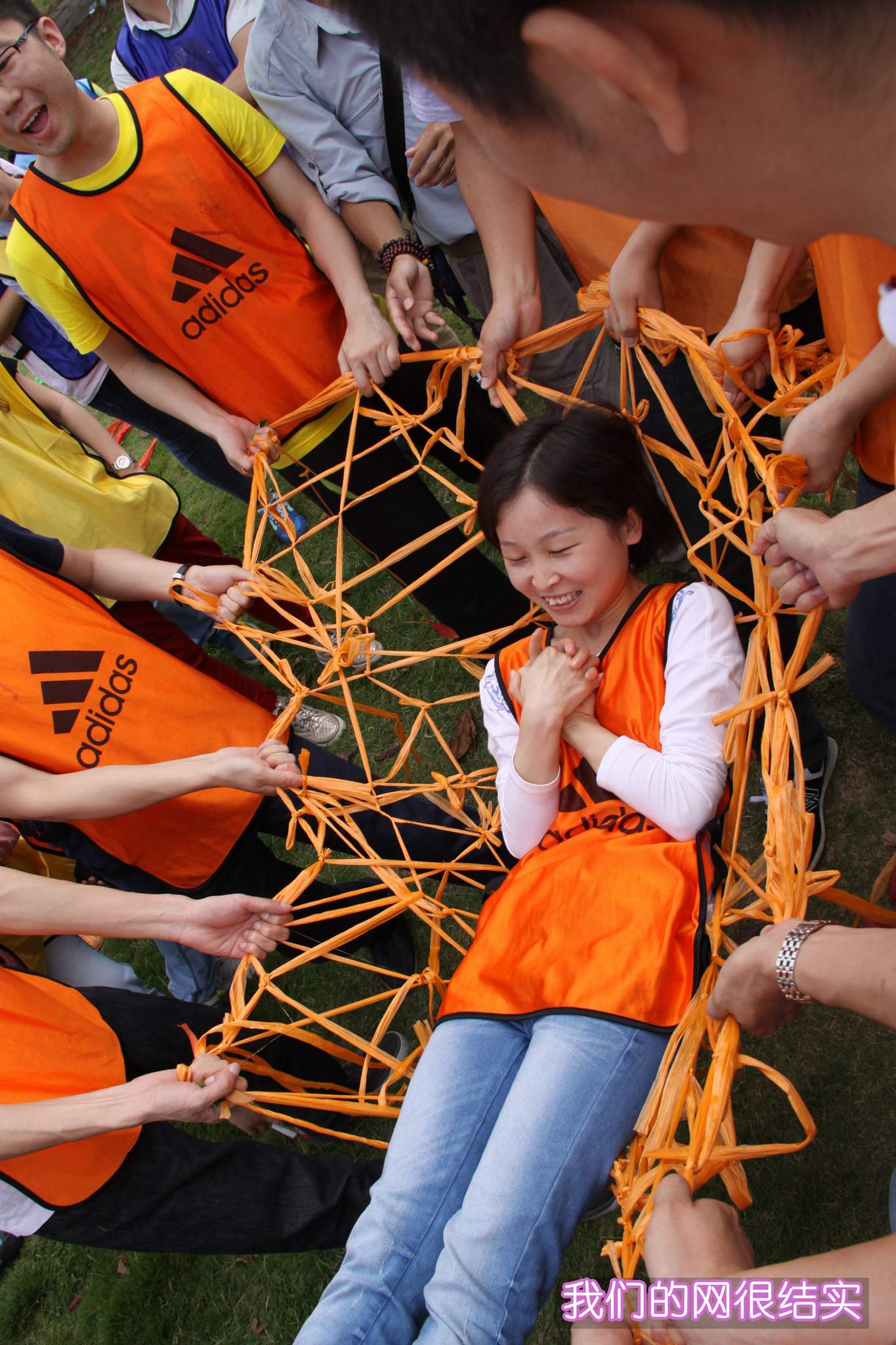??? 在第二個(gè)項(xiàng)目中,隊(duì)員們要用一捆塑料繩編織成網(wǎng),并要能承受一個(gè)人的重量。隊(duì)員們紛紛開動腦筋,一齊動手,很快便完成了任務(wù)。各支隊(duì)伍采用的編制方法不同,形狀也不同,但都能承受起一個(gè)人的重量,可以說不分伯仲。