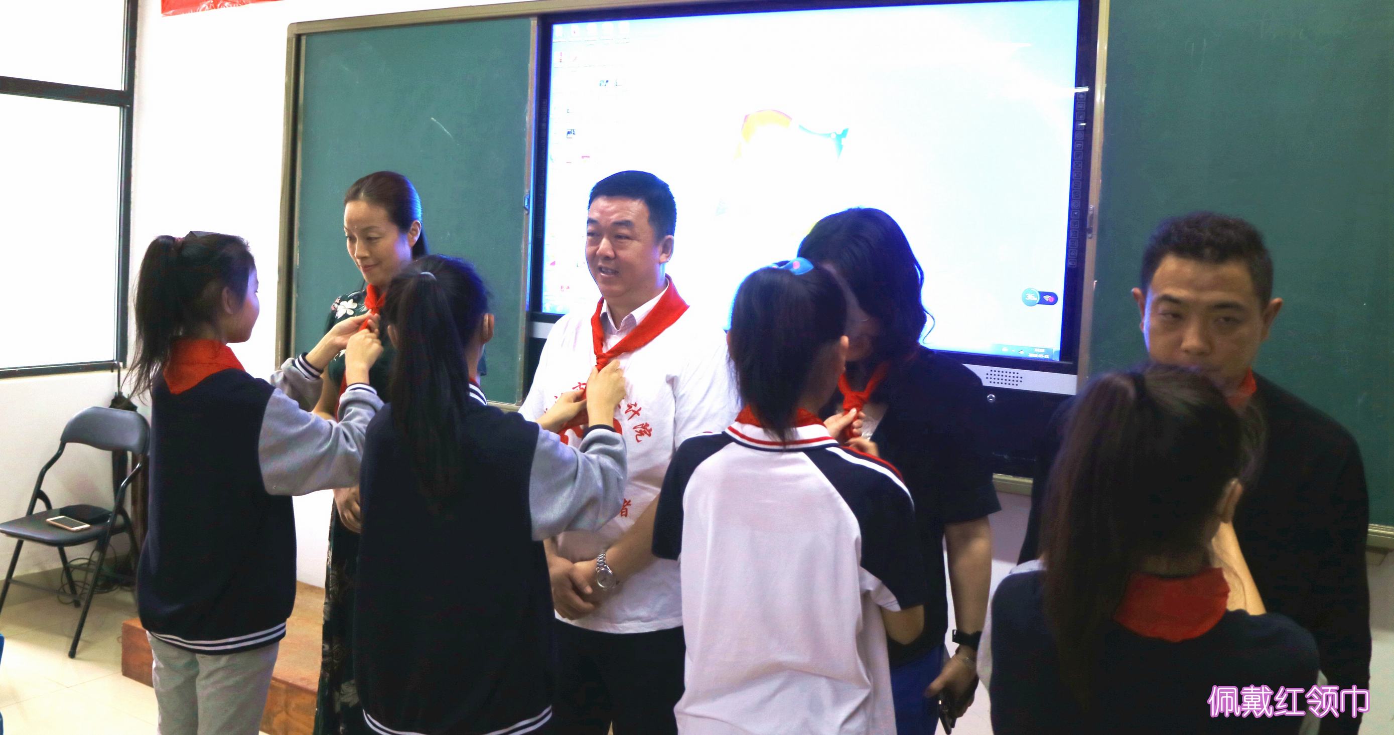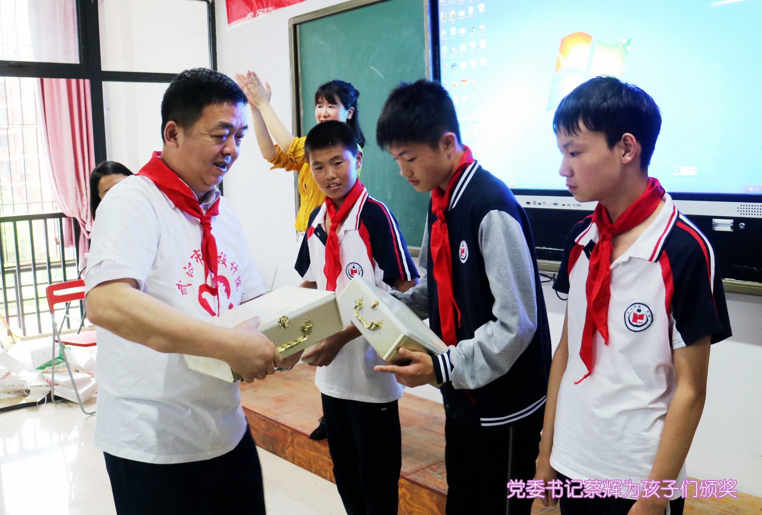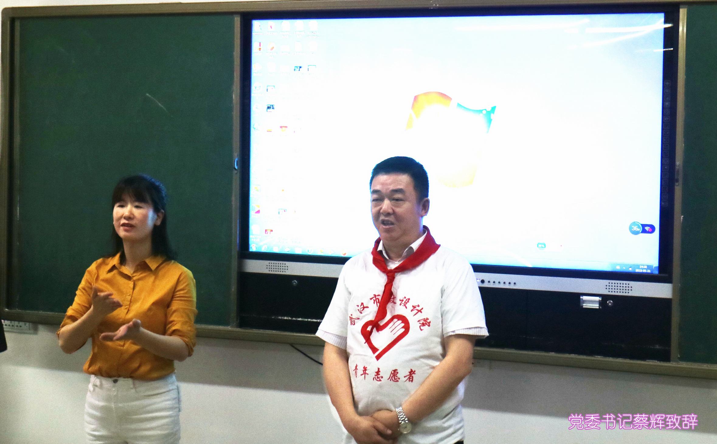 ??? 教室里,志愿者們與孩子們并排而坐,時(shí)而低聲或通過手勢(shì)進(jìn)行交流。公司黨委書記蔡輝、團(tuán)總支書記李俊和學(xué)校黨支部書記舒敏熠、副校長(zhǎng)吳云鵬、楊小玲、團(tuán)委書記楊茜等步入會(huì)場(chǎng)時(shí),全場(chǎng)響起熱烈掌聲,學(xué)生代表為他們系上紅領(lǐng)巾,并用少先隊(duì)隊(duì)禮向他們致敬,領(lǐng)導(dǎo)們則豎起大拇指對(duì)他們表示感謝。