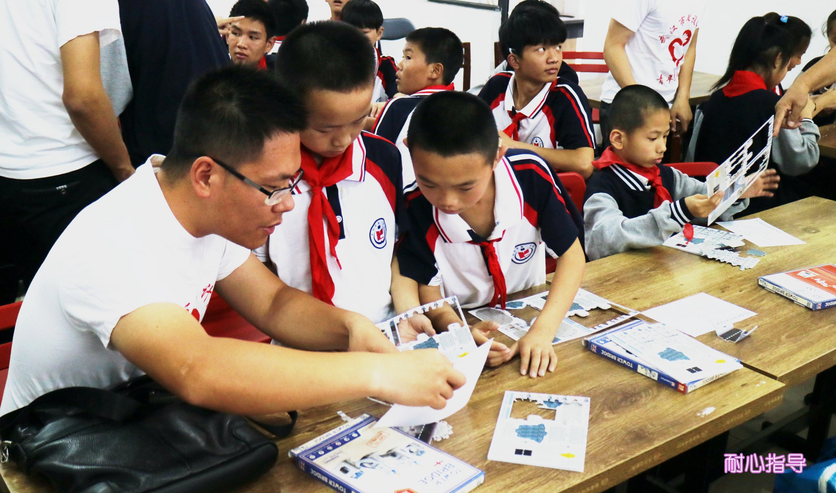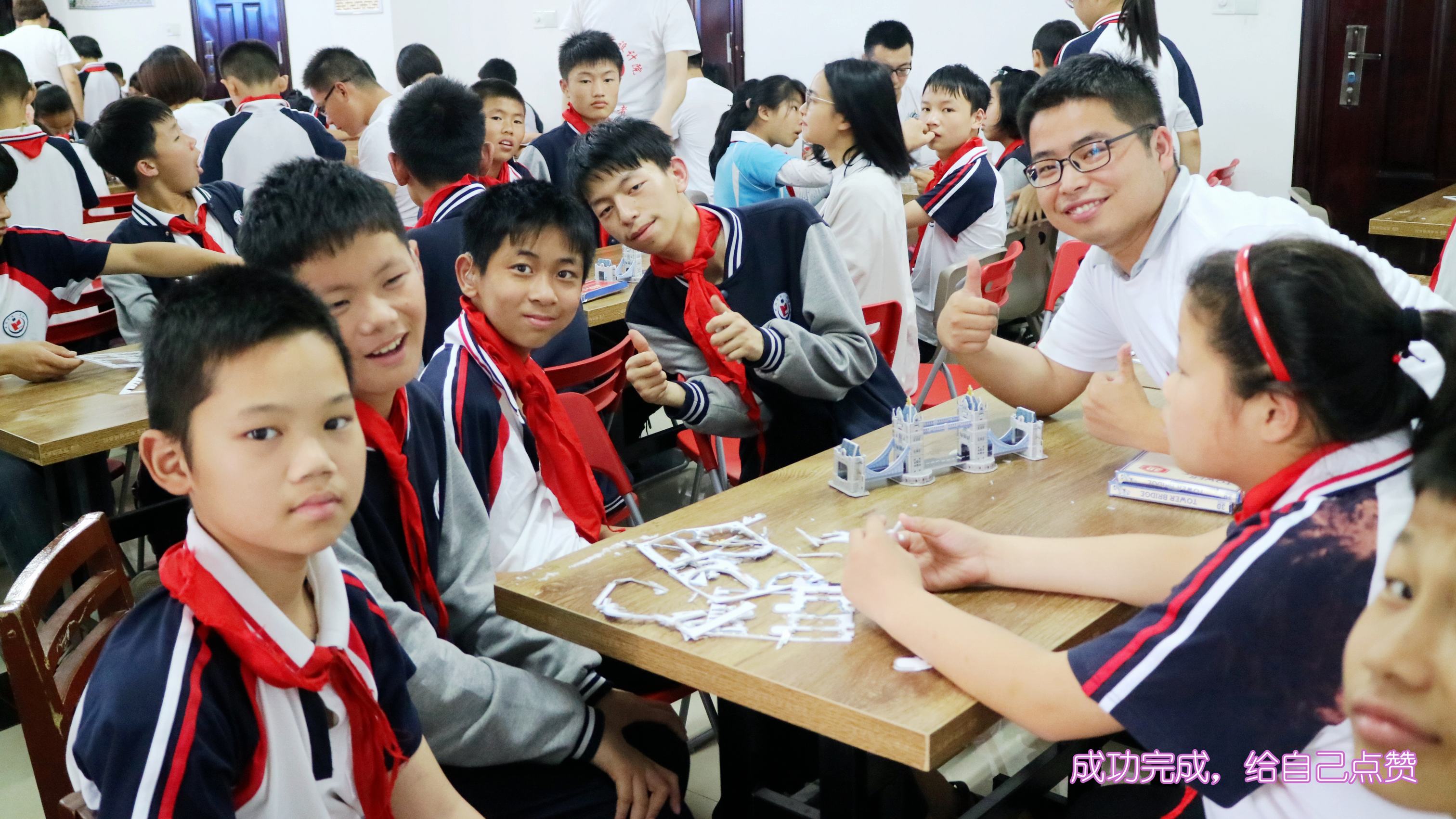 ??? 接下來的“愛心課堂”,志愿者們與孩子們共同協(xié)作,進(jìn)行倫敦雙子塔橋模型的拼裝。在志愿者的幫助下,孩子們小心地將圖板拆解下來,按照說明書的圖示認(rèn)真地開始拼裝。遇到困難的步驟,志愿者們耐心地給他們講解、示范,在孩子們正確拼裝后,志愿者們會(huì)豎起大拇指對(duì)他們進(jìn)行鼓勵(lì)。很快,一座座模型便在他們手中完成了。最先完成的三組,志愿者們都給他們送上了獎(jiǎng)品。